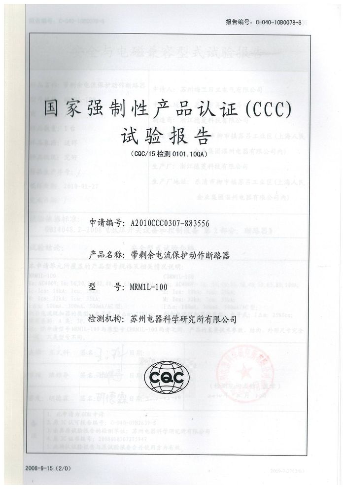 MRM1L-100塑殼漏電資質證書
