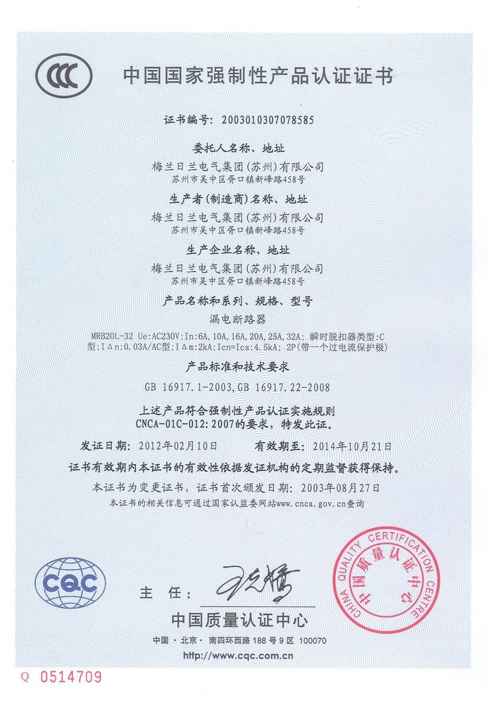 MRB20L-32漏電斷路器資質證書