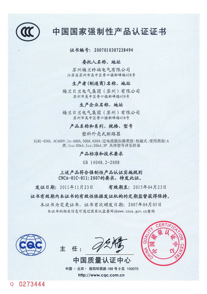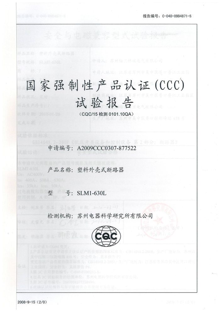 SLM1-630L塑殼斷路器資質證書