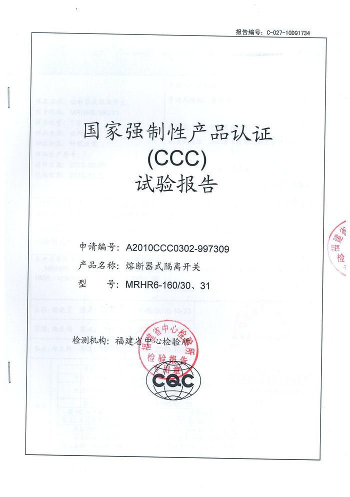 MRHR6-160熔斷隔離開關資質證書