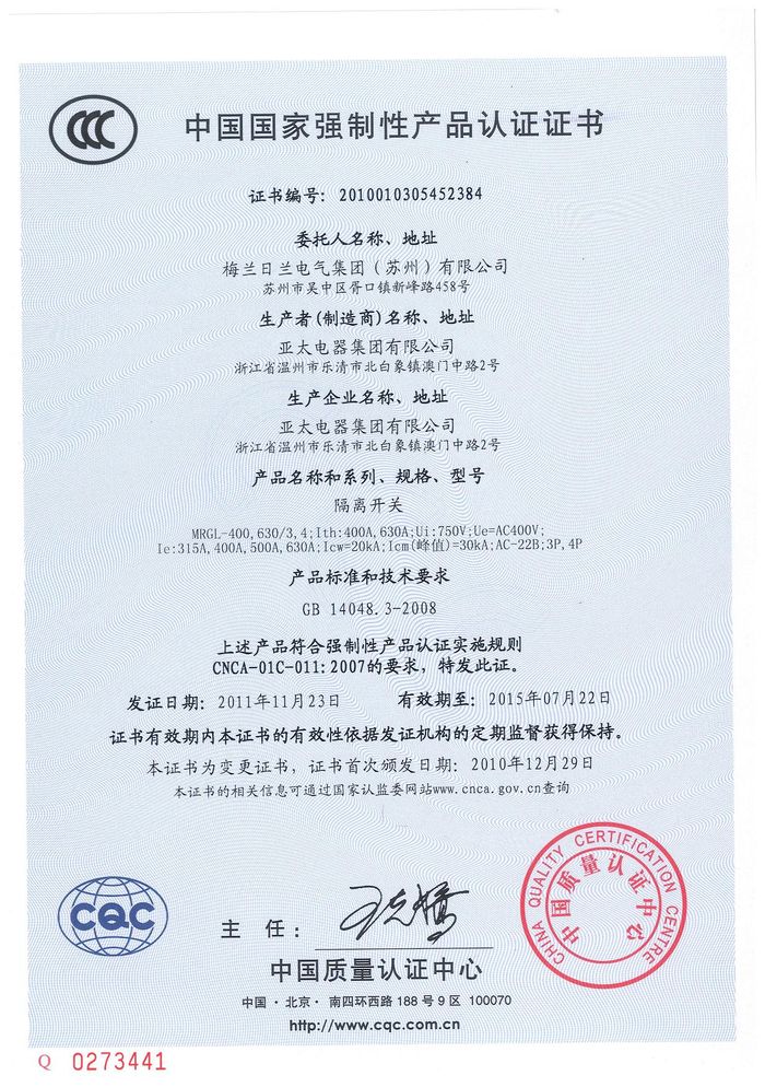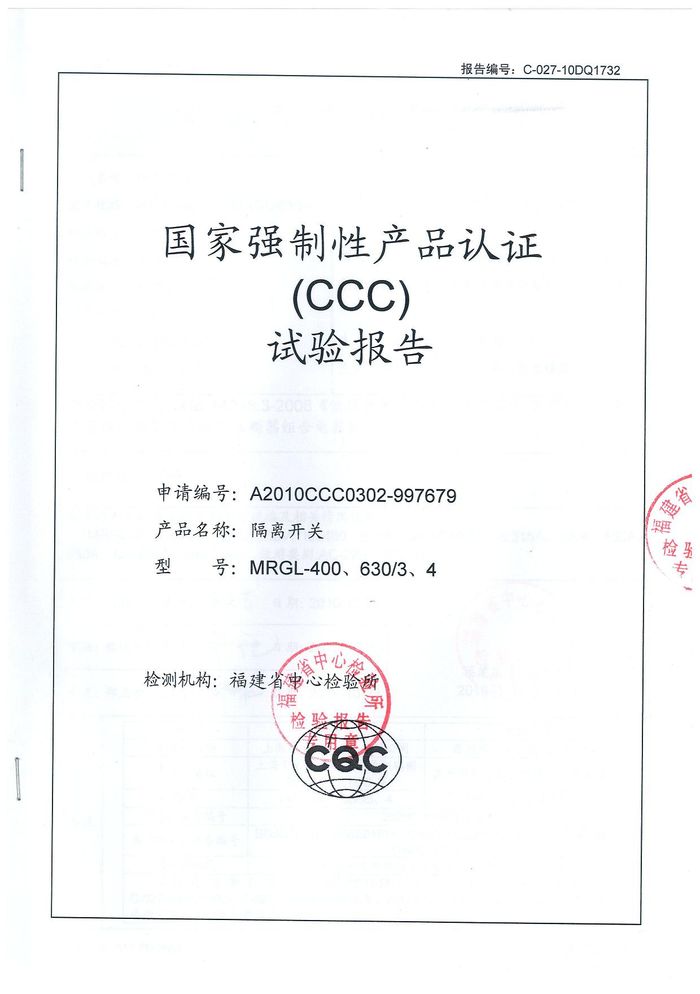 MRGL-400隔離開關資質證書