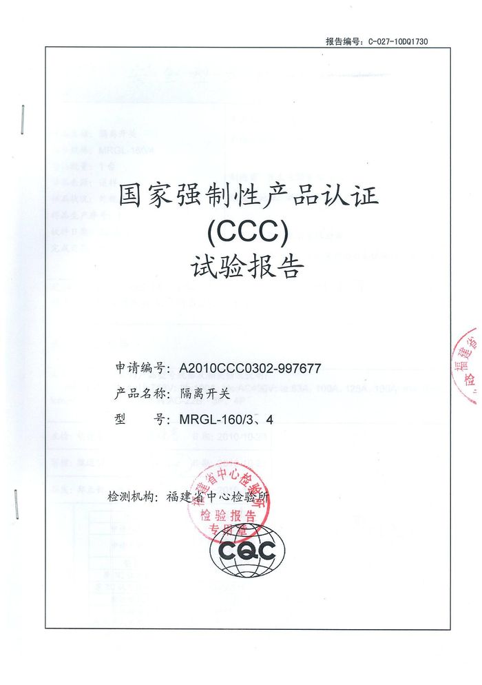 MRGL-160隔離開關資質證書
