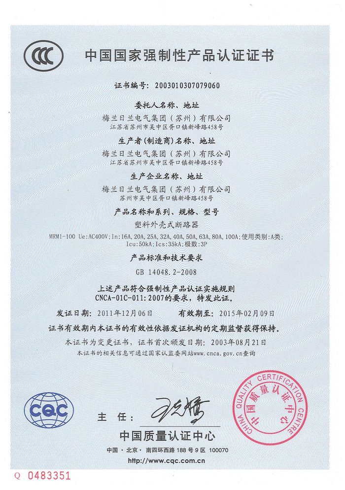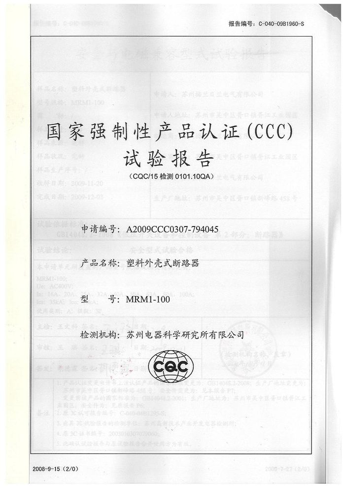 MRM1-100塑殼斷路器資質證書