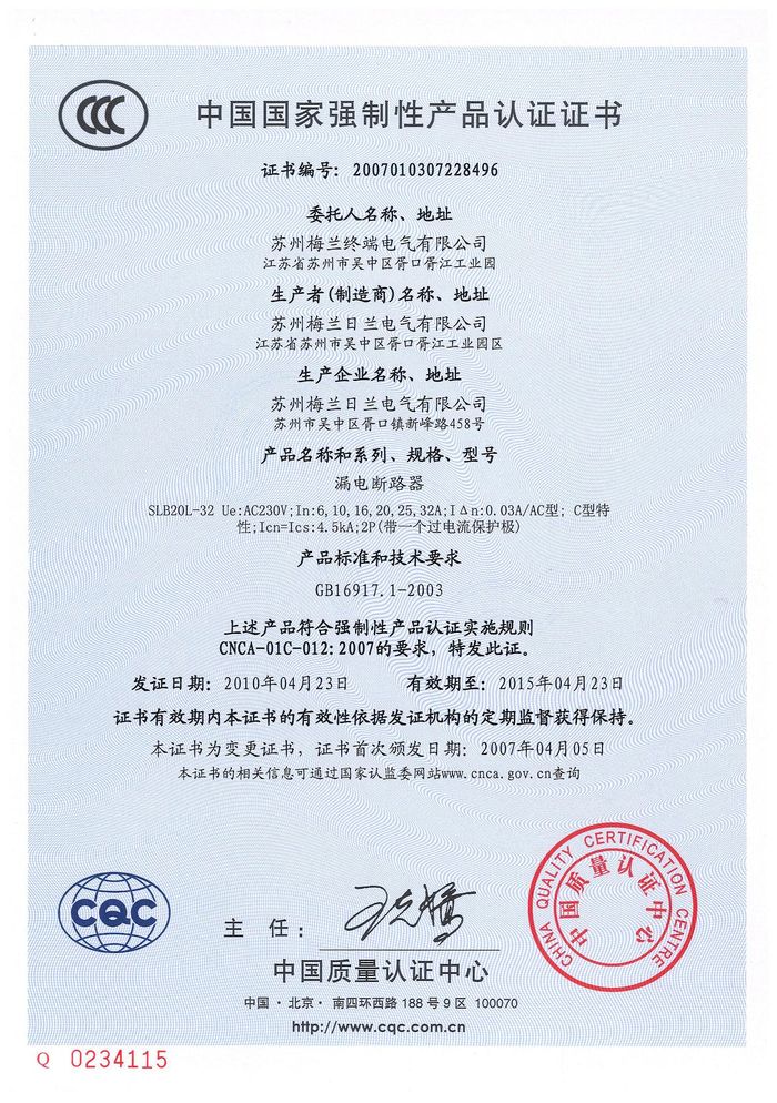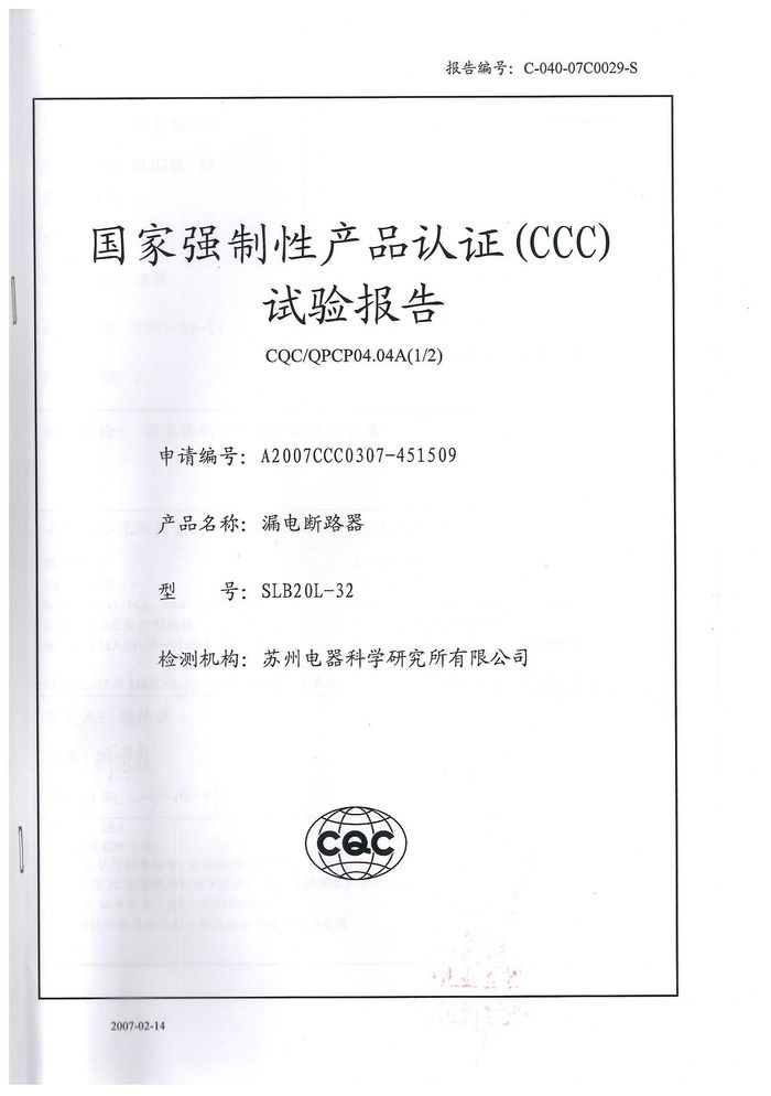 SLB20L-32漏電斷路器資質證書