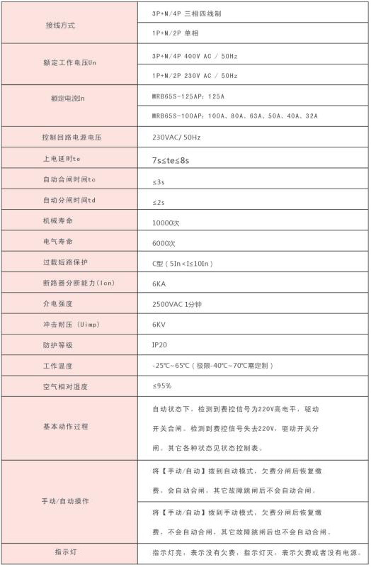 MRB65S-100AP電能表外置斷路器具有短路過載保護,通過對電表控制信號的檢測進行 自動控制接通或斷開負載,實現欠費分閘,付費合閘的自動控制。符臺國家電網《電能表 外置斷路器技術規范》以及GB10963.1家用及類似場所用過電流保護斷路器的標準要求。