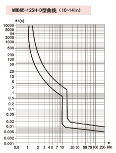 可靠接觸指示 快速閉合 脫扣特性: 口D型曲線: (10-14) In瞬時脫扣 機械壽命:不低于10000次 耐沖擊電壓:6KV 隔離性能:可靠 抗濕熱性: 2類(溫度55℃時,相對濕度為95%) 接線: 采用帶夾箍的接線端子,固定電纜截面可達: 50 FTIFT12 輔助裝置: 可配各種輔助裝置,其中包括MRB65LE附件 脫扣特性曲線