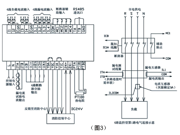 3、分體式剩余電流監控探險測器端子圖和外接線路圖