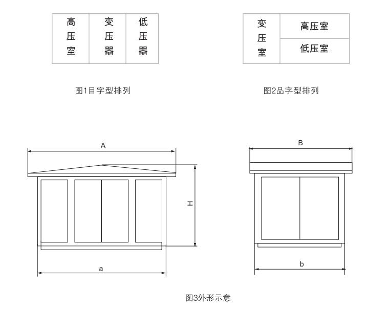 YBW型系列組合式變電站,要根據排列方式分“目”字(圖1)和“品”字(圖2)排列,也可以根據需要演化成其它型式。