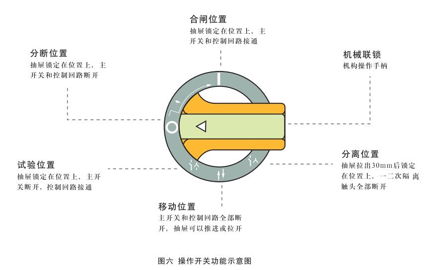 抽屜插入后,將手柄順時針方向轉動時,首先到達“試驗位置”(↓),此時機構將外部電源引入控制回路,用戶通過面板上的安全電器(假如有的話)對電路進行試操作,以確認其是否符合要求,由于主開關尚處于斷開狀態,因此一次回路處于無電狀態,即使操作結果與要求不符也不會損壞設備,繼續順時針方向轉動到手柄處于水平位置時,即“分斷位置”(0)。此時一次和二次回路均處于無電狀態,沿順時針方向繼續旋轉90°則手柄轉到“合閘位置”(I),見圖六。