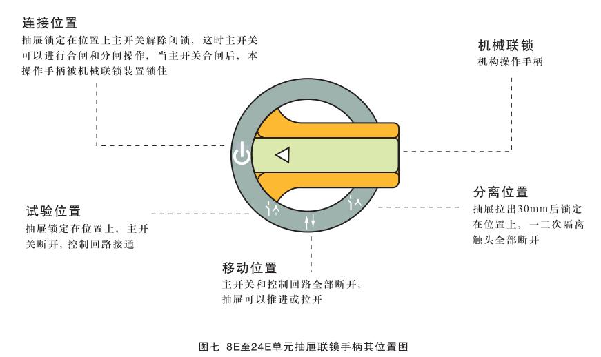 小手柄的操作及其位置定義與8E/4, 8E/2單元操作于柄基本相同,唯一沒有“斷開位置”而代之以“連接位置(↓)。只有當手柄處于此位置時,才可操作主開關操作手柄(大手柄)。大手柄指示箭頭橫向左側時為“分斷位置’,此時一次和二次電路處于無電狀態,大手柄順時針轉動到指示箭頭向上時為“合閘位置”,主開關合閘。小手柄和大手柄的操作有嚴格的機械聯鎖,不能隨意操作,更不能硬扳死撬。注意:只有小手柄處在“連接位置”時,大手柄才能進行合閘操作;同時只有大手柄處在“分斷位置,時,小于柄方能轉動。有時大手柄雖也處在“分斷位置’但定位不準,這會造成小手柄不能轉動或轉動不到位,此時千萬不可硬扳,應再稍轉動大手柄使之準確到位即可。