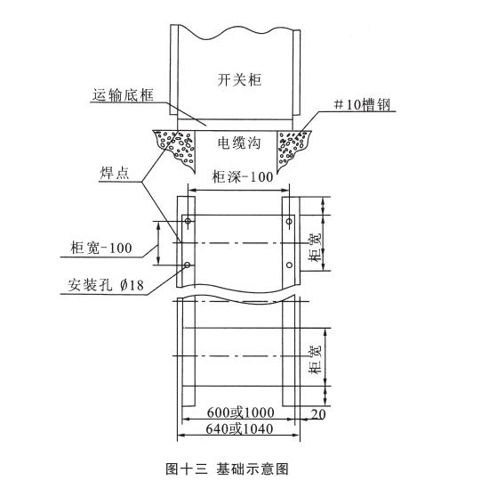基礎處理:電纜溝的寬度由用戶自己選定,用10#槽鋼按圖十一方式預埋并與地面平。如果運輸底柜與基礎槽鋼用螺栓聯接,則基