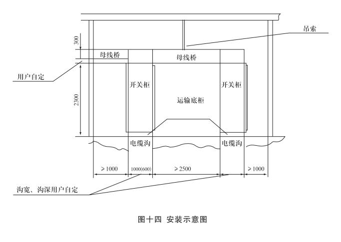 安裝:開關柜就位。找準位置,按圖十一所示進行焊接,焊接節柜和焊長由用戶確定,產品安裝與配電室的相對位置參考圖十二,其中吊索是否安裝由用戶確定,制造商提供的原則是:當母線橋的長度大于3米時應考慮安裝吊索。但是,當母線橋的電流大于或等于2500A時,其長度為2.5米時也應安裝吊索。