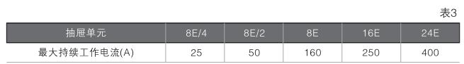 c)抽屜分為8E/4, 8E/2, 8E, 16E和24〔五種單元。各種抽屜持續工作電流的選用按表3